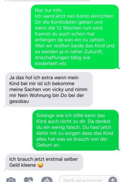 Ich rede nicht vom Unterhalt zahlen sondern das er Finanziell mich unterstützt und sich nicht hier völlig entzieht weil er wollte auch das Kind. Und sich jetzt dem zu entziehen, sehe ich nicht ein! Er hat nicht nur rechte sondern auch Pflichten! Reinstecken und dann sich verpissen, mich stehen lassen und später erwarten das er sein Kind jedes Wochenende haben wird/möchte weis der Geier! Sorry !! Ich wollte nicht dass das ganze so endet! Aber er dreht völlig am Rad Dröhnt sich mit Alkohol Gras und sonst was für Drogen voll, weil er angeblich nicht anders kann, haut Leuten einfach aufs Maul und ich steh hier als blöde da! Klar kann man seine Meinung sagen, aber hier hinter, sitzt einfach auch nur eine Frau die verzweifelt ist, nicht weis was sie machen soll und einfach nach Rat sucht. Ich war seit Samstag im Krankenhaus wegen so nem scheiss Hämatom das durch den ganzen Stress kam. Ich versuche sowie auch gestern mit ihm ruhig zu reden und er hat sich einfach mal den Kopf weggeballert mit Suff. Super. Er pöbeln weiter mit mir rum obwohl er weis das ich Ruhe brauche. Ich suche einfach nur Rat und Hilfe was ich machen kann. Und ich bekomme nur Feuer wo keiner so richtig die ganze Geschichte kennt. Ich kenne ihn so nicht. So war er nicht. Er dreht einfach gerade völlig durch. Blockiert mich über all etc Man ich bin einfach nur verzweifelt und heute frisch aus dem Krankenhaus raus.