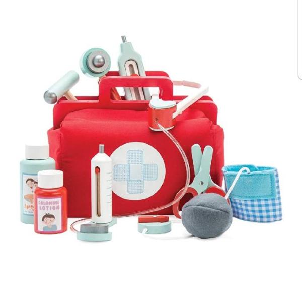 Wir haben die Arzttasche von Le Toy Van. Foto anbei. Kostet etwa 45 Euro. Alles aus Holz und die Tasche aus Stoff. Sehr gute Qualität und hochwertig verarbeitet. Wird seit 2 Jahren sehr gerne bespielt.