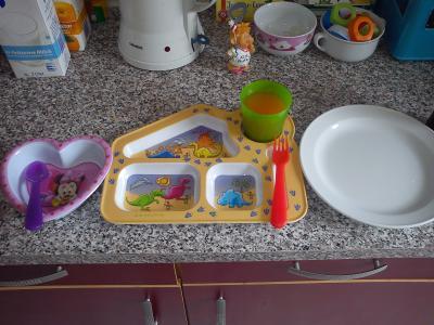 noch einen Plastikbecher, weil das Kind manchmal den Becher runterwirft. Ansonten normales Geschiorr und Besteck. Plastik fand ich immer nervig, weil ich das in meiner Spülmaschine immer verkeilen muss, sonst werden die Näpfe gerne mal rumgeschleudert. Dann stehen die immer voll Wasser, und wenn Du die Maschine aufmachst schwappt Dir die Brühe entgegen. Meine Katzen haben Plastikteller.