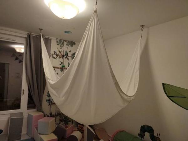 Meine Schwägerin hat sowas auch für ihre beiden Kleinen. Immer wenn die Grosse etwas außer sich ist kann sie sich ins Zimmer zurückziehen, geht ins Tuch und beruhigt sich damit dann selbst. Die Bewegung des Kindes und das Schaukeln sind wahrscheinlich beriuhigend für sie, finde ich gut. Aktuell ist die Älteste fünf Jahre alt und nutzt es noch gern.