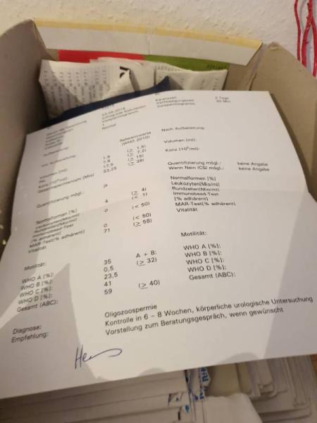 Ich würd ihm einfach sagen, dass du das gefunden hast. Immerhin hat er es offen rumliegen lassen. Scheint also kein Geheimnis zu sein. Und mich nicht verrückt machen. Mit einer Oligozoospermie kann man Vater werden. Nur vielleicht nicht so einfach auf natürlichem Weg. Wobei mein Mann auch sehr eingeschränkt zeugungsfähig ist und ich zweimal spontan schwanger wurde. Wir machen jetzt künstliche Befruchtung, weil es 2 Jahre nach der Missed Abortion nicht mehr klappen will. Das dürfte aber auch daran liegen, dass ich jetzt schon fast 39 bin. Bei meiner ersten Schwangerschaft war ich 31. Da hat meine Fruchtbarkeit vielleicht seine Einschränkung ausgeglichen.