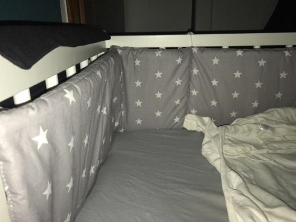Also wir haben im Beistellbett Sinne Stoffumrandung, damit sie nicht mit dem armen oder Beinen zwischen die Stäbe kommt. Wird einfach innen festgebunden...