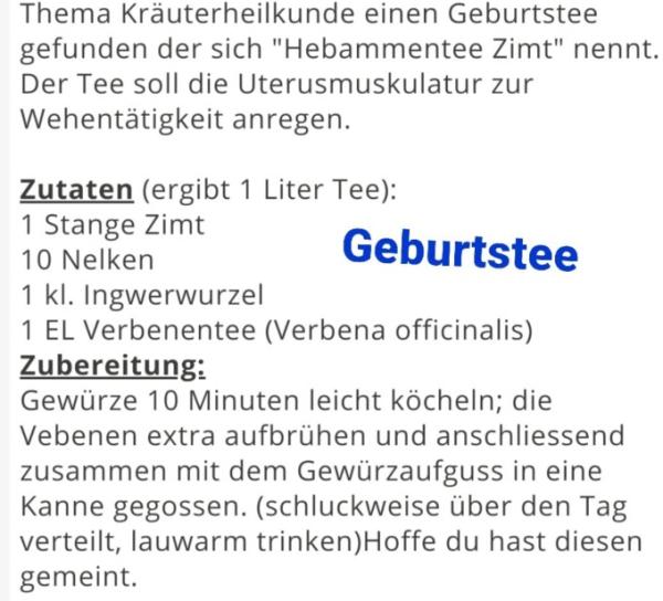 Meine Hebamme hat mir ein Rezept für einen Tee geschickt (siehe Bild). Das klingt aber alles andere als appetitlich, daher warte ich mal mit solchen Tees ![]()