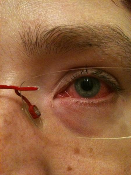 Aii aii so sah mein Auge auch aus nur das es auch angeschwollen war. Hatte eine schlimme Bindehautenzuendung mit 2 Geschwüre im Auge. Musste 2 Tage ein Augenverband tragen und Tagsueber Tropfen und ueber Nacht salbe benutzen. Ich wuensch dir gute besserung und drueck dir die Daumen das es gaaanz schnell vorbei geht