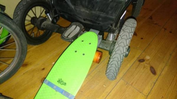 Bei längeren Strecken haben wir anfangs ein umgebautes Skateboard an den Kinderwagen gehangen. Da konnten beide drauf stehen und fanden es toll