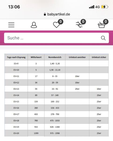 Hallo, Ich hab die Tests auch Zuhause. Das sind 25er. Also sollte ca. ab Fälligkeiten der Periode anzeigen. Ich persönlich finde die Tests nicht so toll. Ich häng dir mal meine Testreihe an. Bei anderen Tests zeigt es bei mir sehr deutlich an und die Marke ist immernoch am schwächsten… bin heute ES+14 und hab ab ES+9 positiv getestet.