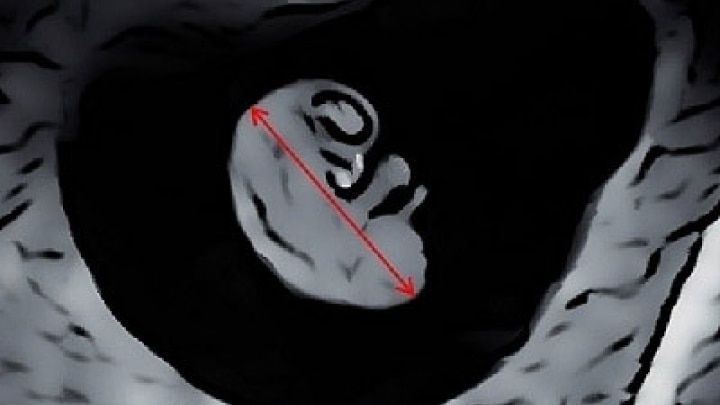 Bild 3: Das Kind zeigt sich (roter Pfeil) zunächst noch ohne Nachweis von Herzaktionen.
